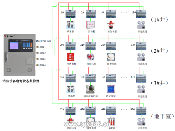 根據智能化管理要求,需要對整個商場綜合樓的消防設備供電電源的工作狀態進行全過程連續監測、集中控制和統一調度。
